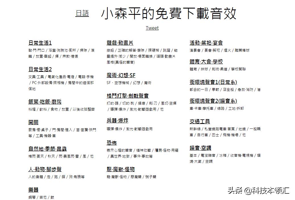 这是一个日本的网站,网站中的音效是小森平提供的。音效素材相当丰富,你可以找到各种类型的音效,而且都是免费的哦。