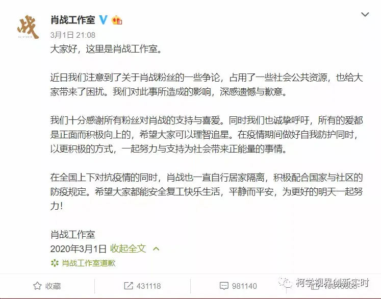 结果,肖战出面为粉丝的不理智行为买单,微博公开道歉。这次的事件已经完全影响了肖战的事业,而且现在正值疫情时期,关注的这次事件的人数也是大幅度提升,截止投稿前微博已经有一百万的评论,感觉肖战的路人缘基本上被败光了。最后也是希望各路粉丝理性发言,疫情还没有结束,做好该做的防范措施。