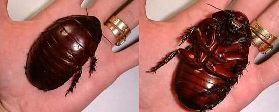 一般的蟑螂是可以飞的,但是犀牛蟑螂与众不同,它是一只没有翅膀的蟑螂,也许因为它太胖了,以至于飞不起来,所以翅膀退化了。犀牛蟑螂只能慢慢的爬行,能够打一个一米深的地洞当巢穴,所以又被叫做“巨型掘地蟑螂”。