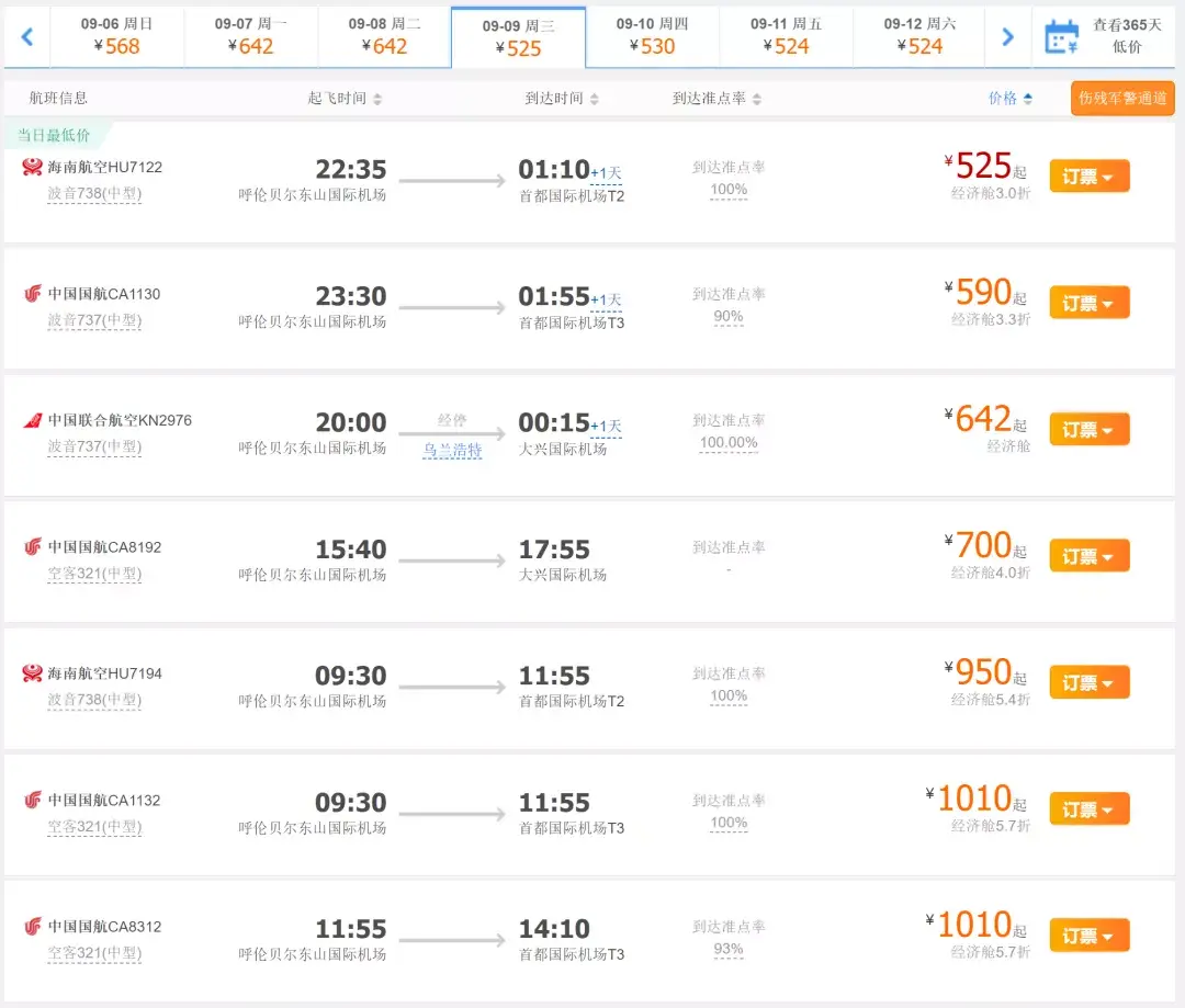 海拉尔—北京¥525起