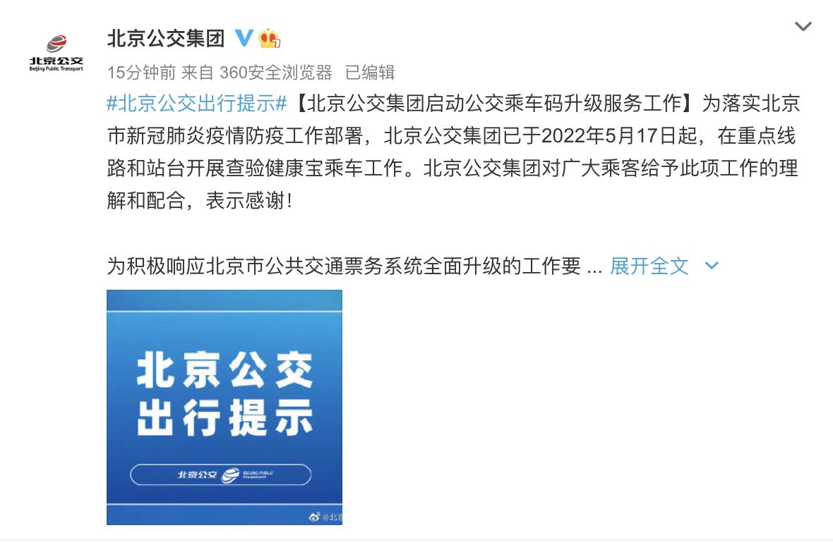 为落实北京市新冠肺炎疫情防疫工作部署,北京公交集团已于2022年5月17日起,在重点线路和站台开展查验健康宝乘车工作。北京公交集团对广大乘客给予此项工作的理解和配合,表示感谢!