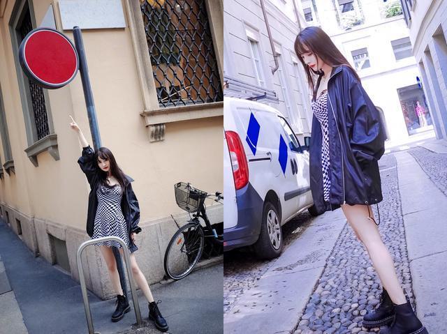高腰的连衣裙,搭配图案的设计,更加时尚感,搭配黑色外套,同色系马丁靴,拉长腿部线条,街头感十足