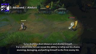 塞拉斯向目标方向突进一小段,并获得一层护盾。短暂延迟后,塞拉斯可以再次施放该技能,向前挥舞锁链,对第一个命中的敌方英雄造成伤害并眩晕,同时将自己拉至目标处。