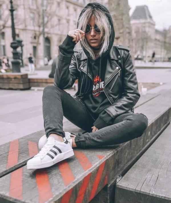 运动休闲的卫衣更加的慵懒随性,当然也是内搭的好单品。切记只适合稍大的机车夹克,否则塞不进还硬塞一件卫衣在里面,只会看着更拧巴。