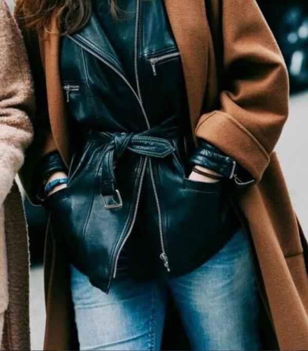气温还较冷的北方城市,不妨延续秋冬流行的穿搭法,外套一件大衣,把机车夹克当做一件帅气的内搭来穿。
