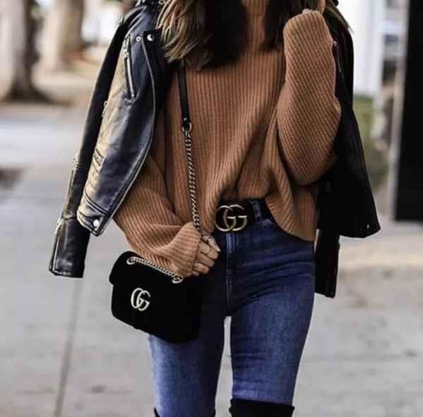 当然啦,不管是为了凹造型,还是为了保暖,在机车夹克中穿一件好看的毛衣,就会很有型,前提是皮衣不能太小哦!