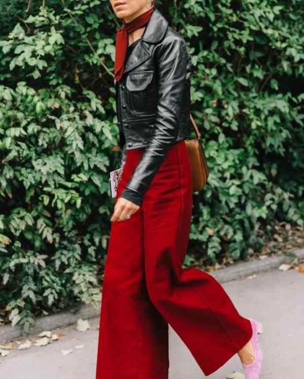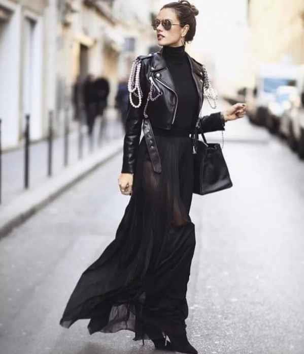 搭配柔软顺滑的雪纺单品,将机车夹克的硬朗之感与雪纺的飘逸质感相碰撞,帅气又不失女人味。