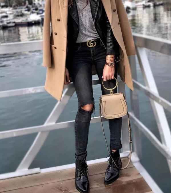硬朗的机车夹克叠穿大衣,一身硬气,全身黑固然有态度,但考虑到亚洲人种肤色问题,混入驼色色或适当点缀亮色才可取。