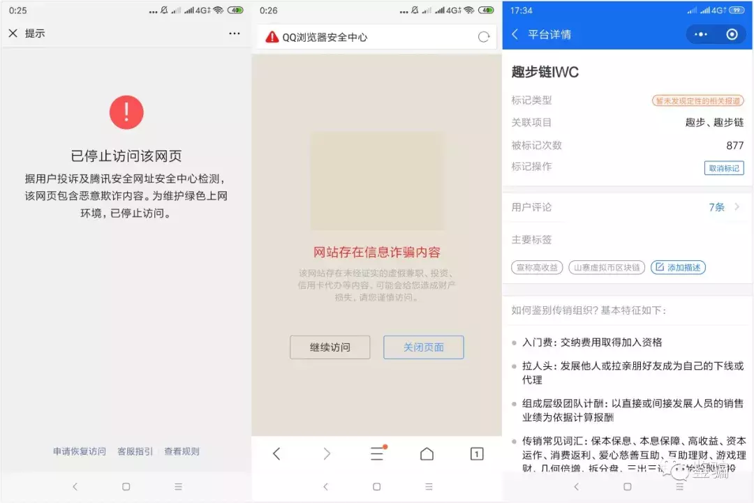 值得注意的是,鉴骗公众号登陆GHT交易所网站发现,微信和QQ浏览器均提示该网站存诈骗内容。QQ浏览器提示,“该网站存在未经证实的虚假兼职、投资、信用卡代办等内容,可能会给您造成财产损失,请您谨慎访问。”而微信则提示,“据用户投诉及腾讯网安全中心检测,该网页包含恶意欺诈内容。为维护绿色上网环境,已停止访问。”而“趣步链IWC”已经在腾讯的灵鲲金融安全中心被标记了877次。