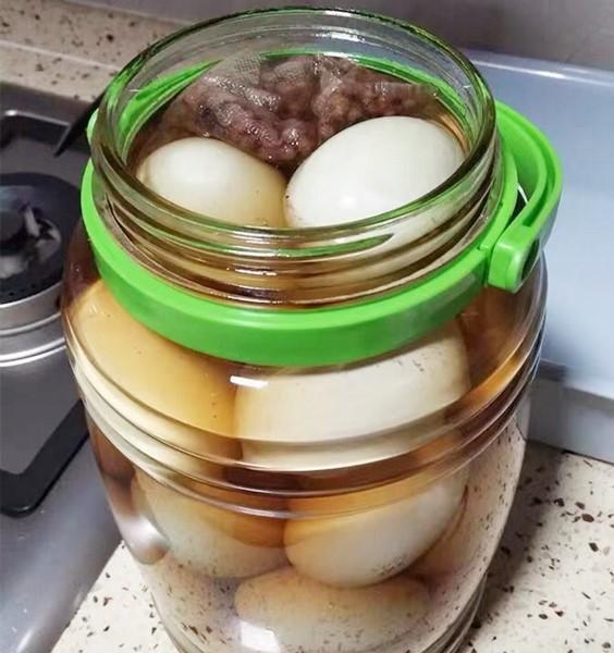 腌鸭蛋的容器也要无水无油,最好拿开水烫洗一遍晾干,把鸭蛋整齐放入容器中,倒入晾凉的料汁,最后再倒入大约400克白酒,白酒的作用是提香、杀菌、增长保质期的作用,一定要加哦。最后瓶口封上保鲜膜,拧紧盖子,放到阴凉处腌制就可以了,一般7天就能吃,时间越长越入味,是不是超级简单?