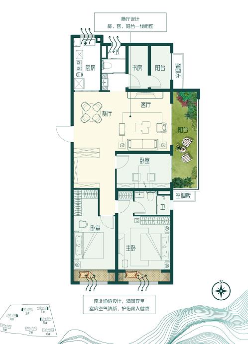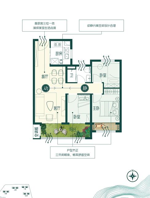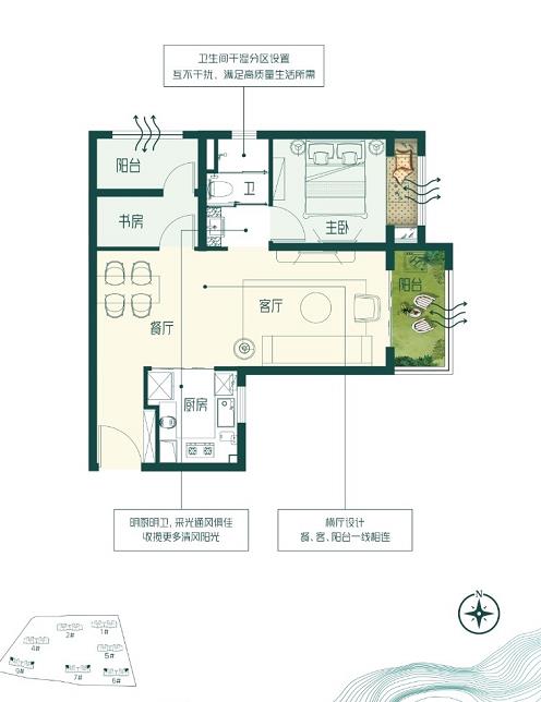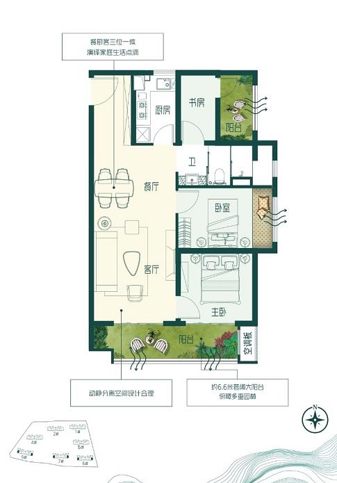 优点:主卧客厅朝南,厨房书房朝北,卧室朝东。动静分离,约6米6大阳台设计,餐厅客厅一体,显得客厅也比较大。