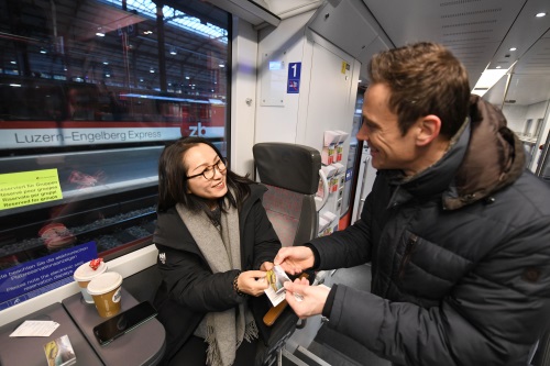 2月14日,在瑞士卢塞恩开往因特拉肯地区的金色山口列车上,瑞士中部铁路公司工作人员(右)为中国游客发巧克力。 新华社记者 连漪 摄
