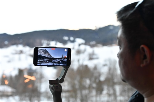 2月14日,一名中国游客在瑞士少女峰拍摄雪山景色。 新华社记者 连漪 摄