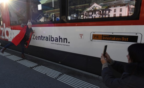2月14日,中国游客在瑞士卢塞恩开往因特拉肯地区的金色山口列车旁拍照留念。 新华社记者 连漪 摄