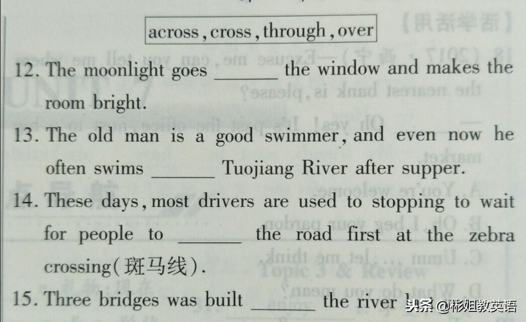 (2)cross 意为“横过,渡过”,作动词,相当于go/walk across 例如: