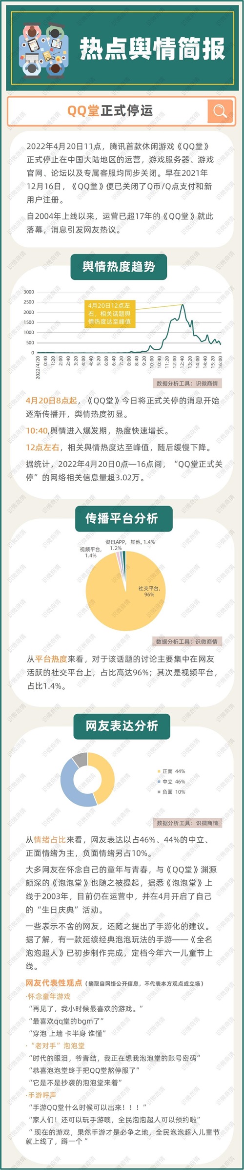 4月20日8点起,《QQ堂》今日将正式关停的消息开始逐渐传播开,舆情热度初显。并在12点左右达至峰值,随后缓慢下降。据统计,2022年4月20日0点—16点间,“QQ堂正式关停”的网络相关信息量超3.02万。