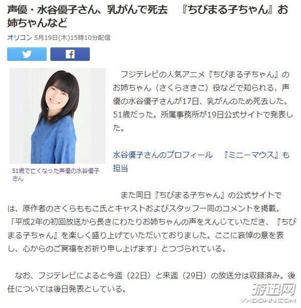 知名声优水谷优子因病逝世 曾为樱桃小丸子的姐姐配音