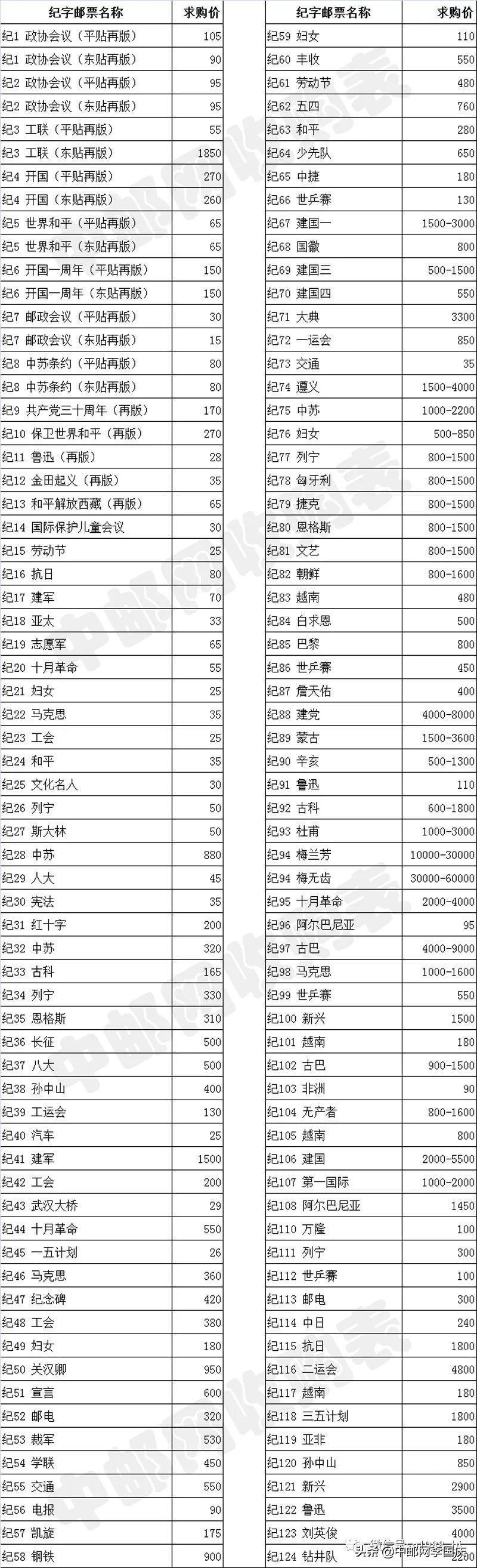 纪念邮票收购最新价格表