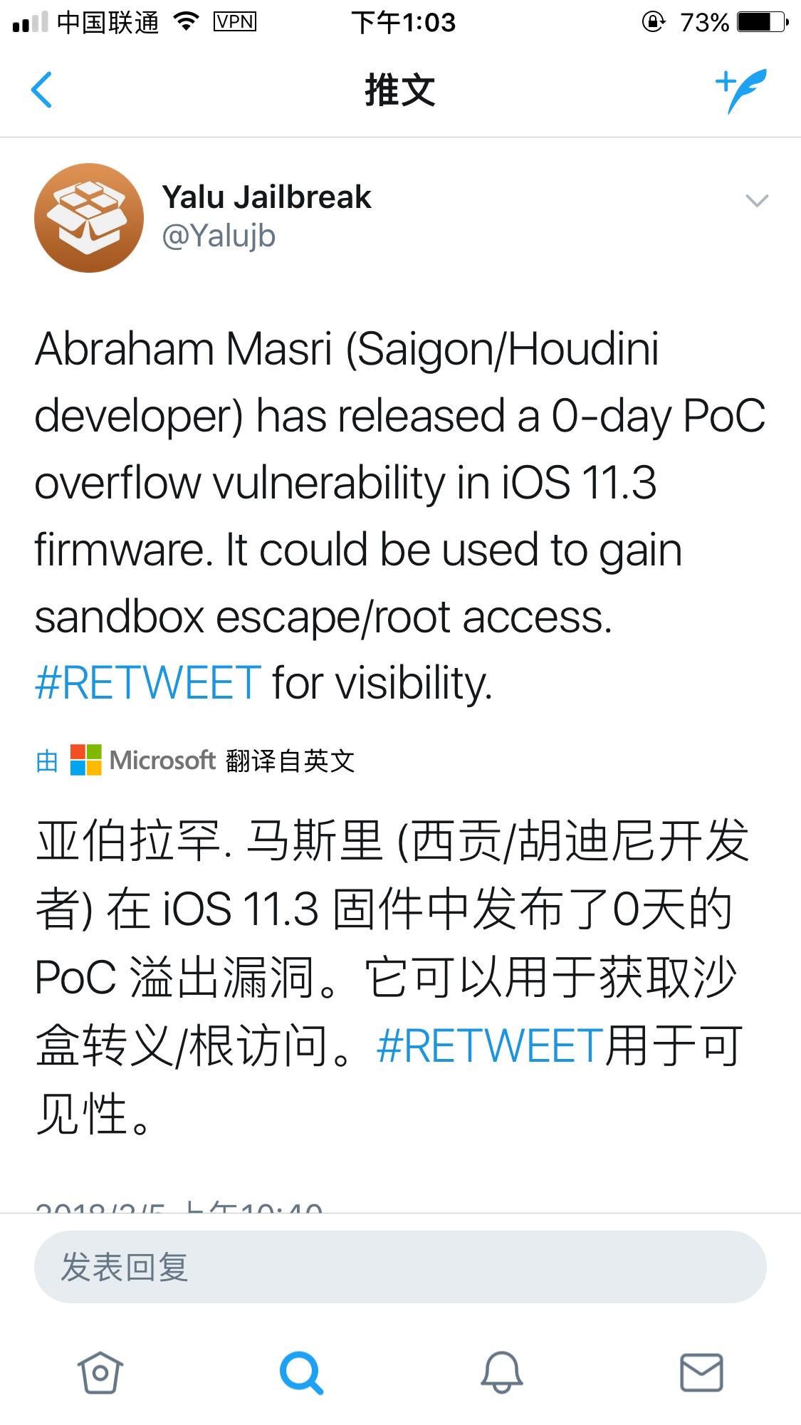 快讯,iOS10.2.1Saigon越狱开发者Abraham Masri 在 iOS 11.3 固件中发布了0 Day 安全漏洞PoC。IOS 11.3看来越狱有望。想要越狱的用户可以观望一下。