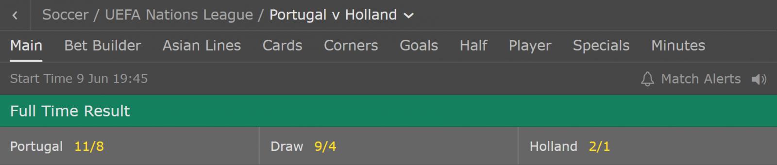 虎扑6月9日讯 今晚,葡萄牙和荷兰的欧国联决赛即将打响,两队中的胜者将获得首届欧国联冠军。赛前,各机构普遍给出葡萄牙让平半高水的初盘,东道主是更被看好的一方。