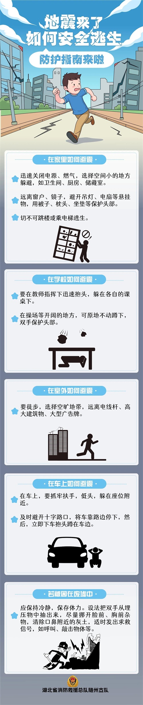 地震是破坏性极强的自然灾害,虽无法避免和控制,但掌握科学避险方法和逃生技巧,有助于减轻灾难带来的伤害。戳图学习逃生技巧,关键时刻能救命!(来源:随州消防)#你好守护者联盟#