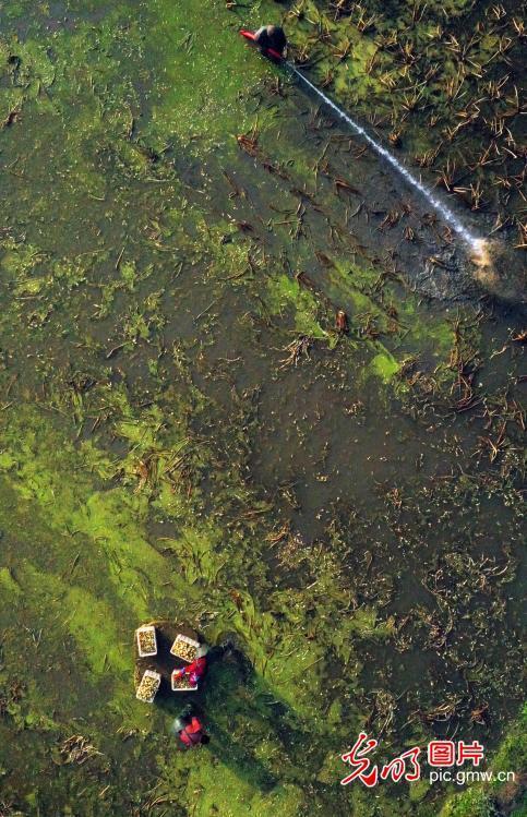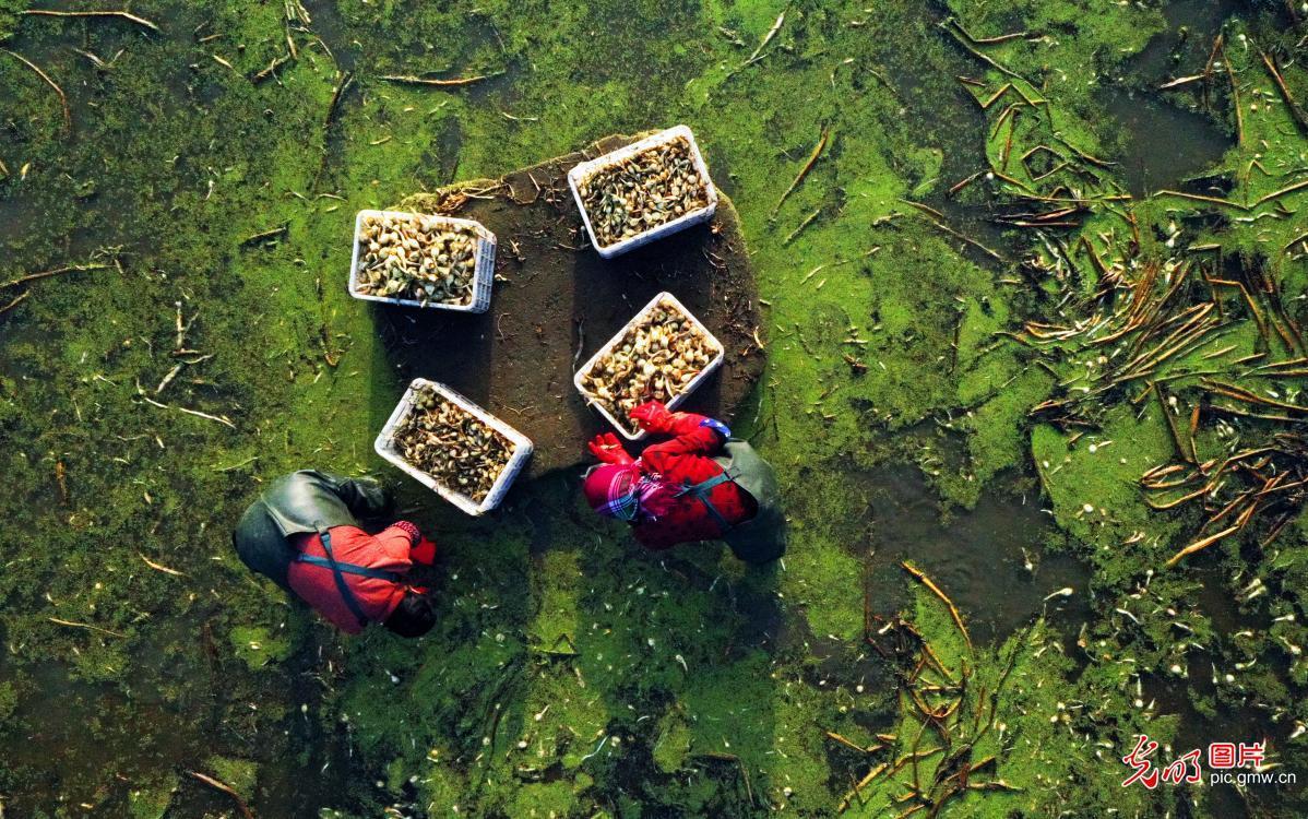 2019年12月23日,江苏省苏州太仓市双凤镇勤力村农民在水田间采收茨菰。当地利用丰富的河沟水网,种植近200亩荸荠、莲藕、茨菰等水田蔬菜,亩均产量在2000斤左右,将大大丰富周边上海、苏州等地节日"菜篮子"市场。(计海新摄/光明图片)( 文章来源:光明图片)