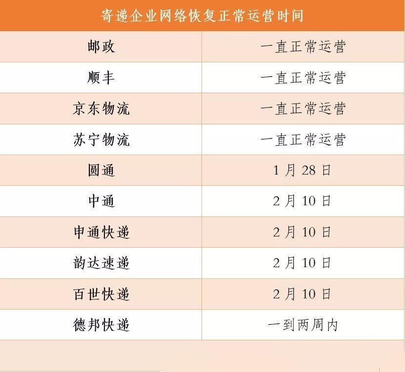 全国各大快递公司复工时间表: