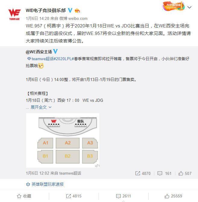 LOL英雄联盟WE战队正式在微博发布公告宣布,WE.957(柯昌宇)将于2020年1月18日WE vs JDG比赛当日,在WE西安主场完成属于自己的退役仪式!//@WE电子竞技俱乐部: WE.957(柯昌宇)将于2020年1月18日WE vs JDG比赛当日,在WE西安主场完成属于自己的退役仪式,届时WE.957将会以全新的身份和大家见面。活动详情请大家持续关注后续官博公告。