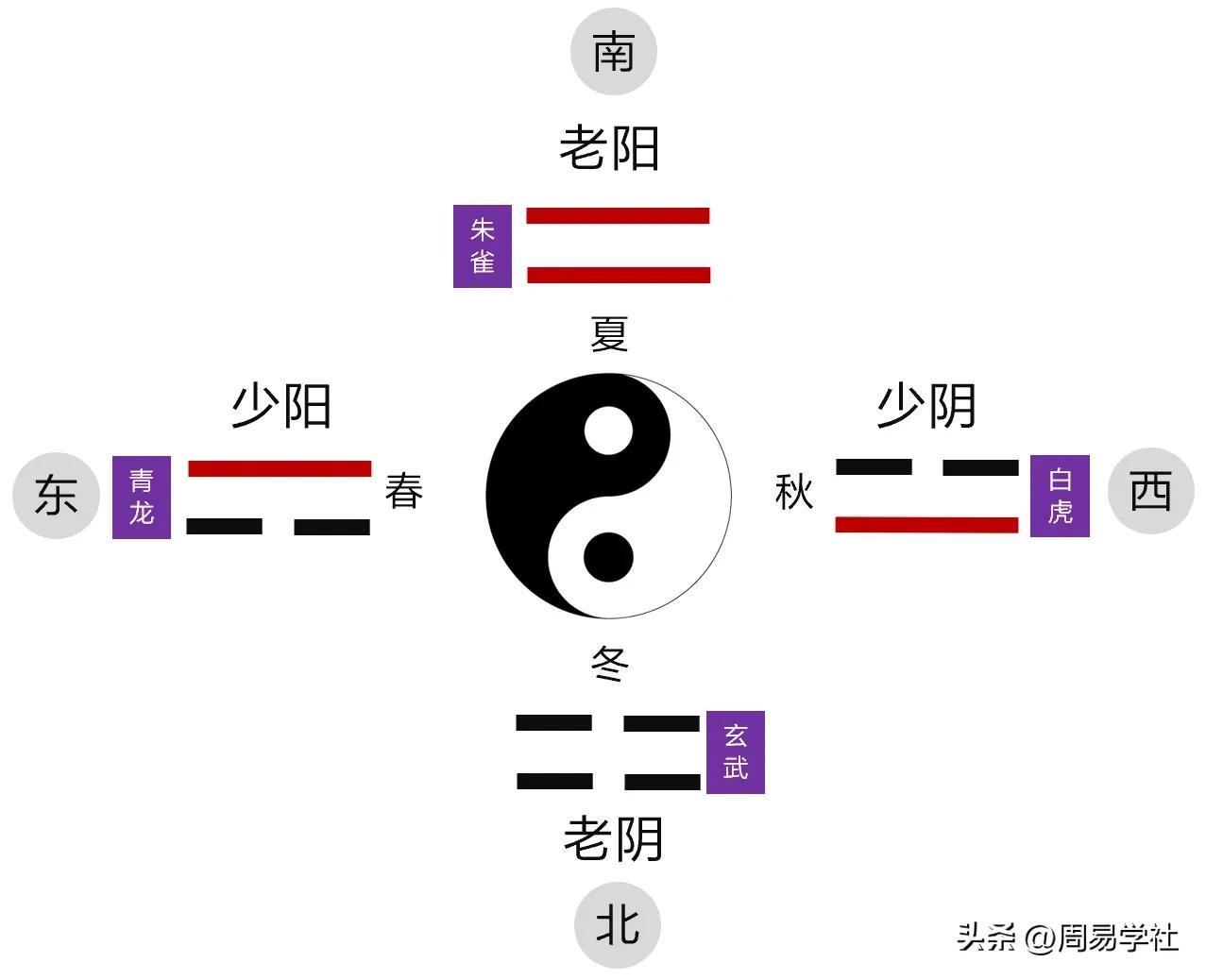 四象是在一阴一阳符号之上复生一阴一阳符号的组合,分别是老阳、老阴、少阳、少阴。