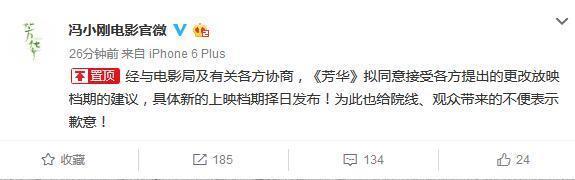 从这个截图可以看出,冯小刚电影官微也是说清楚了的,确定是要撤档了,也表示非常的可惜,表示对不起观众、院线。