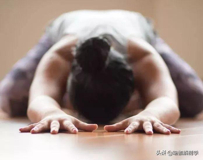 跪立在垫面上双脚并拢臀部坐向脚后跟双膝打开略大于髋部,吸气延展脊柱呼气俯卧向下,双手臂伸展前额点地,保持5-8个呼吸