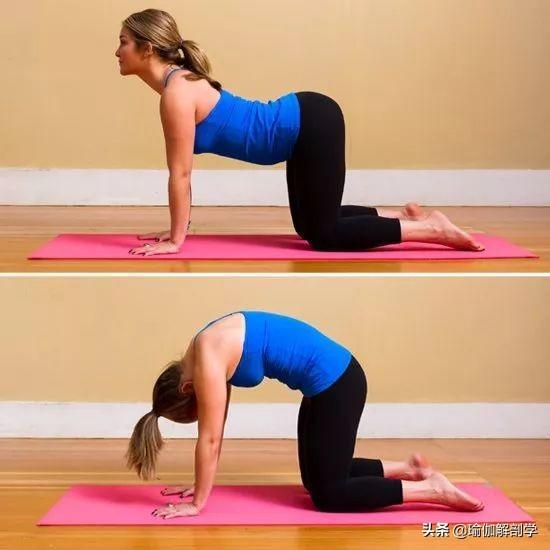 跪立在垫面上,双腿双手打开与髋同宽双腿双手垂直于垫面,脚背小腿贴地吸气抬头挺胸,呼气含胸拱背注意一节一节的延展脊柱重复练习5-8组