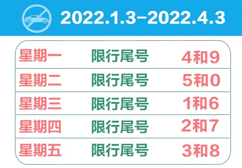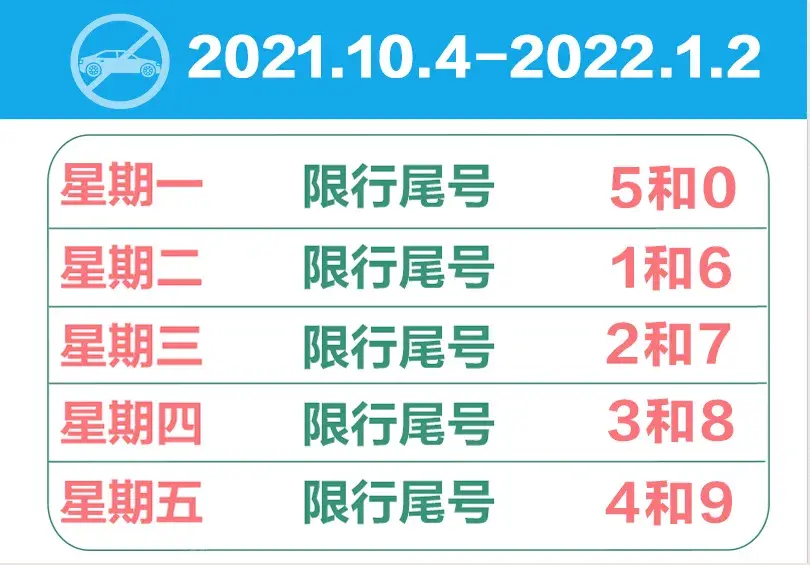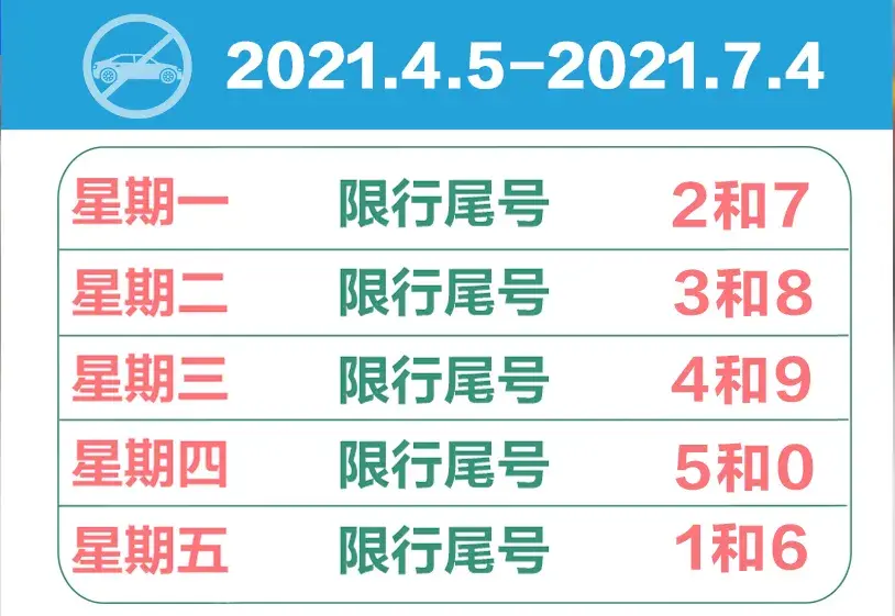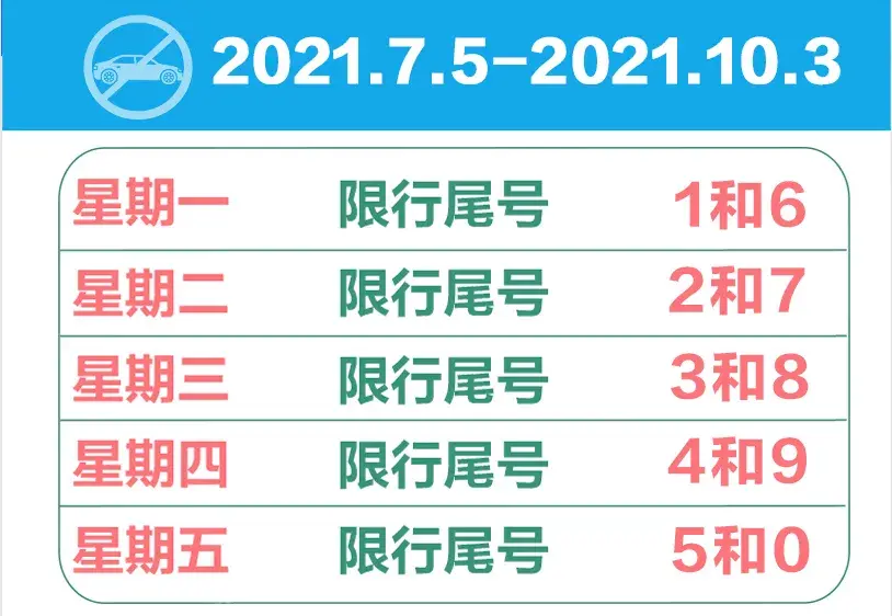 按照北京和天津实施的限行规定,2021年7月5日起,新一轮尾号限行即将开始。自2021年7月5日至2021年10月3日,星期一至星期五限行机动车号牌尾号分别为1和6、2和7、3和8、4和9、5和0。