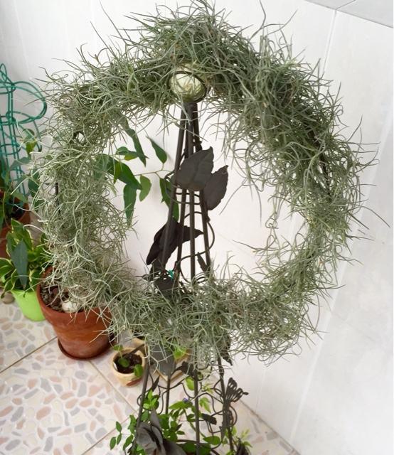 松萝凤梨,凤梨科,铁兰属,本种耐寒力极强。又叫松萝铁兰、老人须。远看松萝像一顶假发,像一团胡须,高悬在半空中,不见水土滋养,甚至连根在哪儿也看不到,这就是松萝凤梨的神奇之处。它靠叶子上的鳞片吸收空气中的水分与养分,故又名“空气草”。