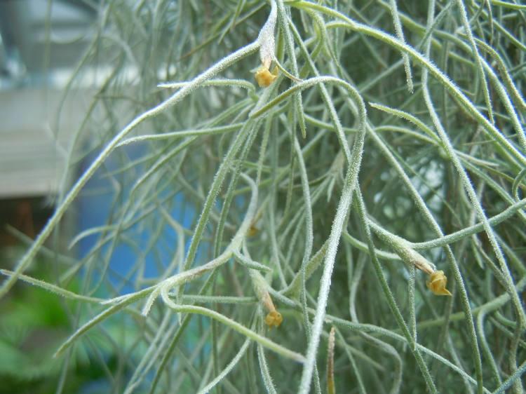 松萝凤梨植株下垂生长,茎长纤细;密被银灰色鳞片;小花腋生,黄绿色,花萼紫色,花具芳香。