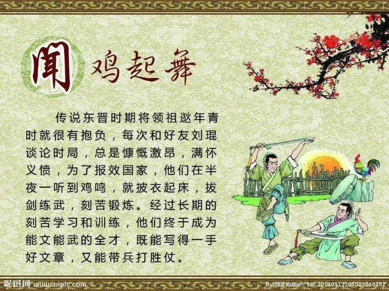 闻鸡起舞,是一个古老的中国故事,讲述了东晋时期著名将领祖逖的英勇事迹。这个故事不仅展示了祖逖的坚毅和毅力,更彰显了中国古代人民不屈不挠,奋发向前的精神风貌。闻鸡起舞的故事开始于祖逖年轻的时候。当时,他生活在一个战乱频繁的时代,家境贫寒,但他胸怀大志,不畏艰难困苦。一天,当他在听到鸡鸣的时候,突然下定决心要为国效力。从此以后,每当鸡鸣声响起,无论刮风下雨还是酷暑严寒,他都会立即起床,锻炼身体,苦练武艺。祖逖的毅力和勤奋最终得到了回报。他不仅在军队中脱颖而出,成为一位杰出的将领,还成功地为国家收复了失地。他的英勇事迹激励了无数后人,成为了中国历史上不朽的传奇。闻鸡起舞的故事告诉我们,只有通过不懈的努力和奋斗,才能实现自己的梦想和目标。祖逖的精神是我们学习的榜样,他告诉我们,无论遇到多大的困难和挫折,只要我们坚定信念,勇往直前,就一定能够战胜困难,取得胜利。在今天这个充满竞争和挑战的时代,我们需要发扬祖逖的精神,以坚定的信念和毅力去迎接每一个新的挑战。只有这样,我们才能在激烈的竞争中立于不败之地,为实现中华民族伟大复兴的中国梦贡献自己的力量。