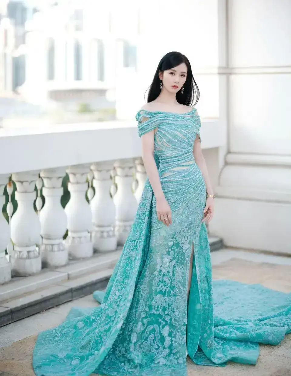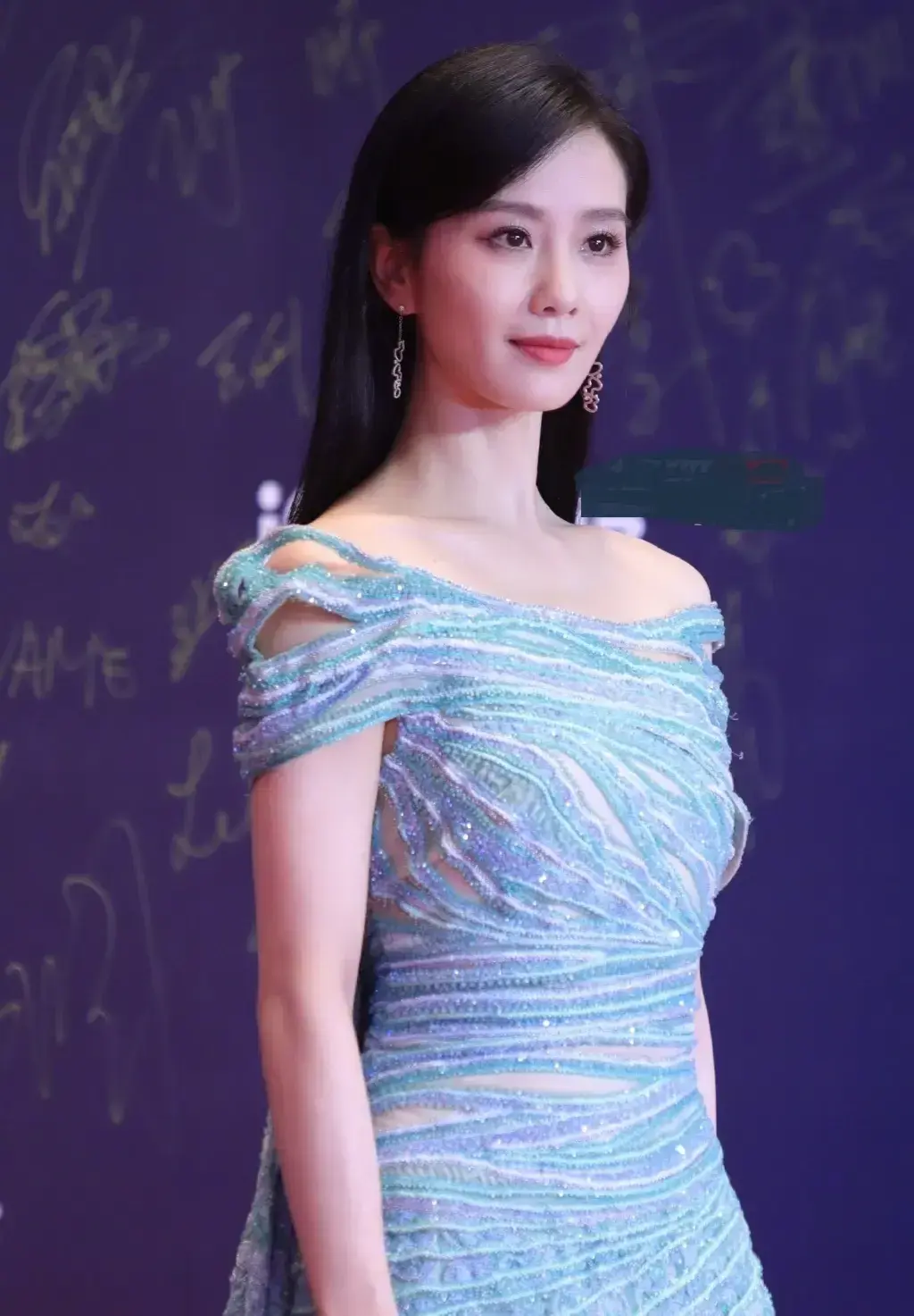 在活动现场,刘诗诗身穿一件水绿色露肩长裙,展现出优雅高贵的气质。她的妆容也十分精致,淡雅的眼妆和自然的口红色调让她看起来更加迷人。此外,她还佩戴了一对华丽的耳环,为整个造型增添了一丝时尚感。