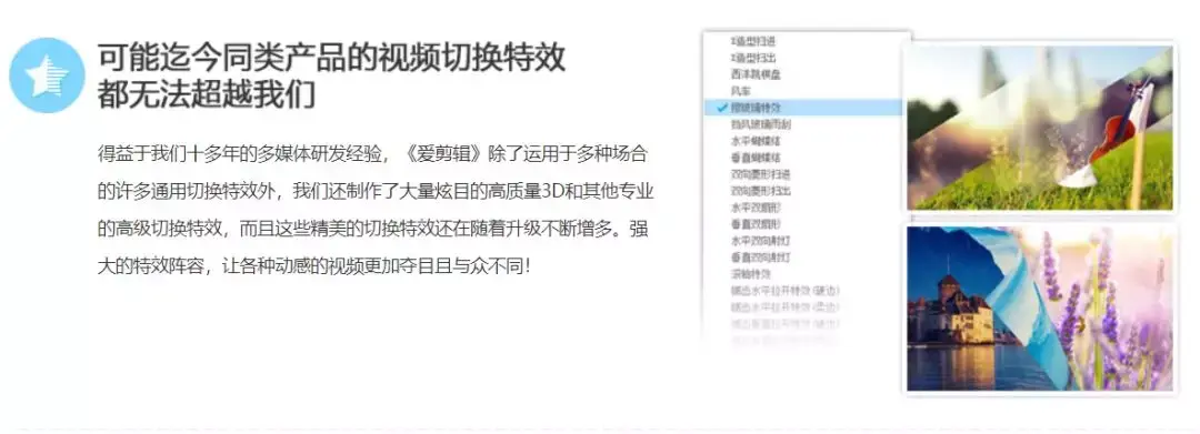 软件还自带了很多特效,比如字幕特效、叠加特效、转场特效、画面特效