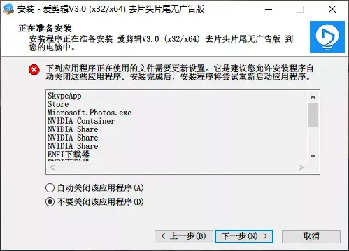 如果安装时提示需要关闭软件安装,可以选择不用关闭软件安装