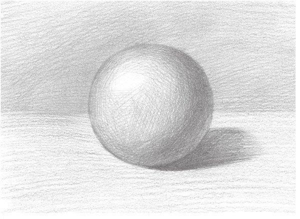 1、使用2B铅笔,画出物体的基本形体,要安排好画面的构图。 素描球体绘画步骤1 2、依据光源位置,画出物体明暗交界线。注意形体结构。 素描球体绘画步骤2 3、接着画出物体的投影,注意投影的大小