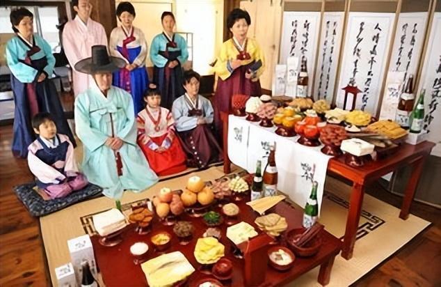 正月初一,祭祀祖先是韩国春节中最重要的活动之一。他们认为,去世的祖先只有在这天会回来,因此要给祖先们备好食物,摆好在供桌上。