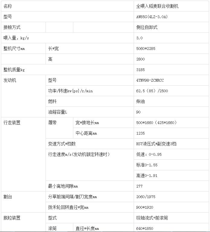 洋马AW85G(4LZ-3.0A)全喂入稻麦联合收割机技术参数