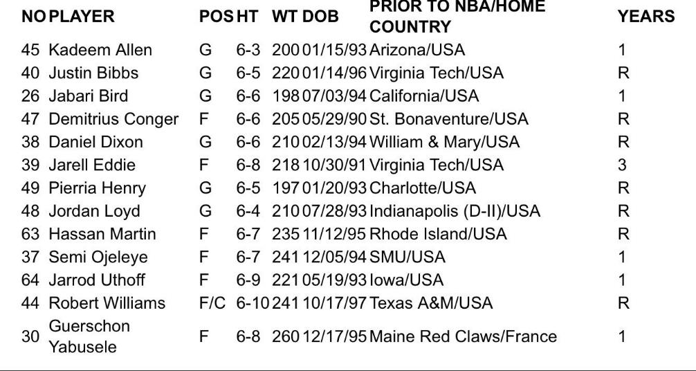 阵容名单中包括现凯尔特人球员卡迪姆-阿伦、贾巴里-伯德、谢米-奥杰莱、Robert Williams、盖尔雄-亚布塞莱,以及Justin Bibbs、Demitrius Conger、Daniel Dixon、Jarell Eddie、Pierria Henry、Jordan Loyd、Hassan Martin、Jarrod Uthoff。