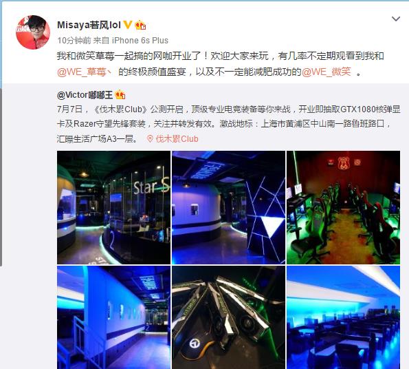 虽然老WE的人员都已经退役很久了,但是五人之间的感情还是很好的,经常聚会碰面的。昨天大鼻子若风在微博宣布,他和草莓及微笑3人联手的开的网咖正式营业了。让我们上图看一下