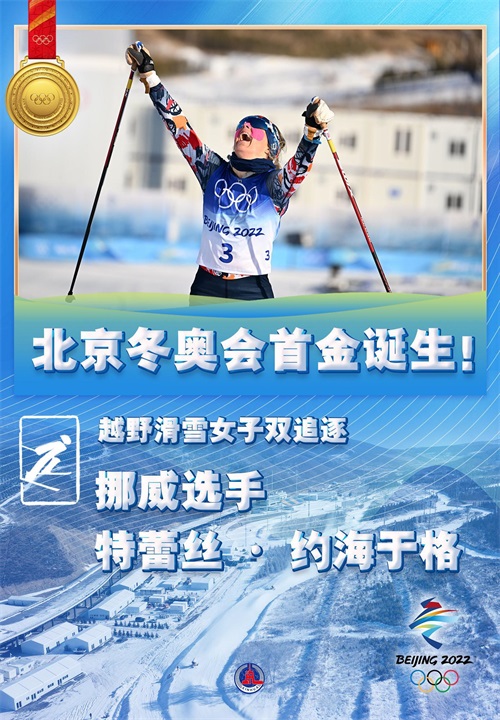 2月5日,北京2022年冬奥会越野滑雪女子双追逐(7.5公里传统技术+7.5公里自由技术)比赛在国家越野滑雪中心举行。挪威选手特蕾丝·约海于格夺得本届冬奥会首枚金牌。