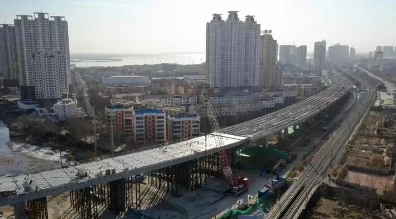 西港路南延伸工程,长度大约1.3公里,连续跨越西港路、河北大街、京哈铁路。