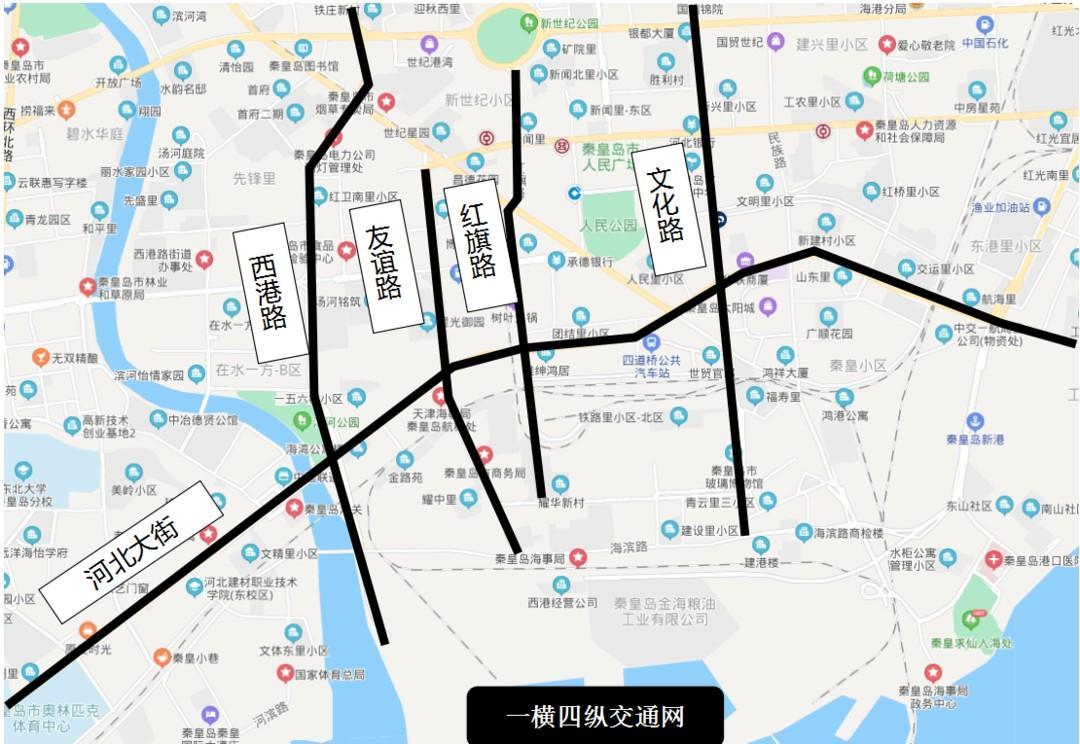 ◆缓解市区“一横四纵”道路交通压力,整体提升城市交通运载能力和总体形象。“一横”即河北大街;“四纵”即文化路、友谊路、红旗路、西港路。