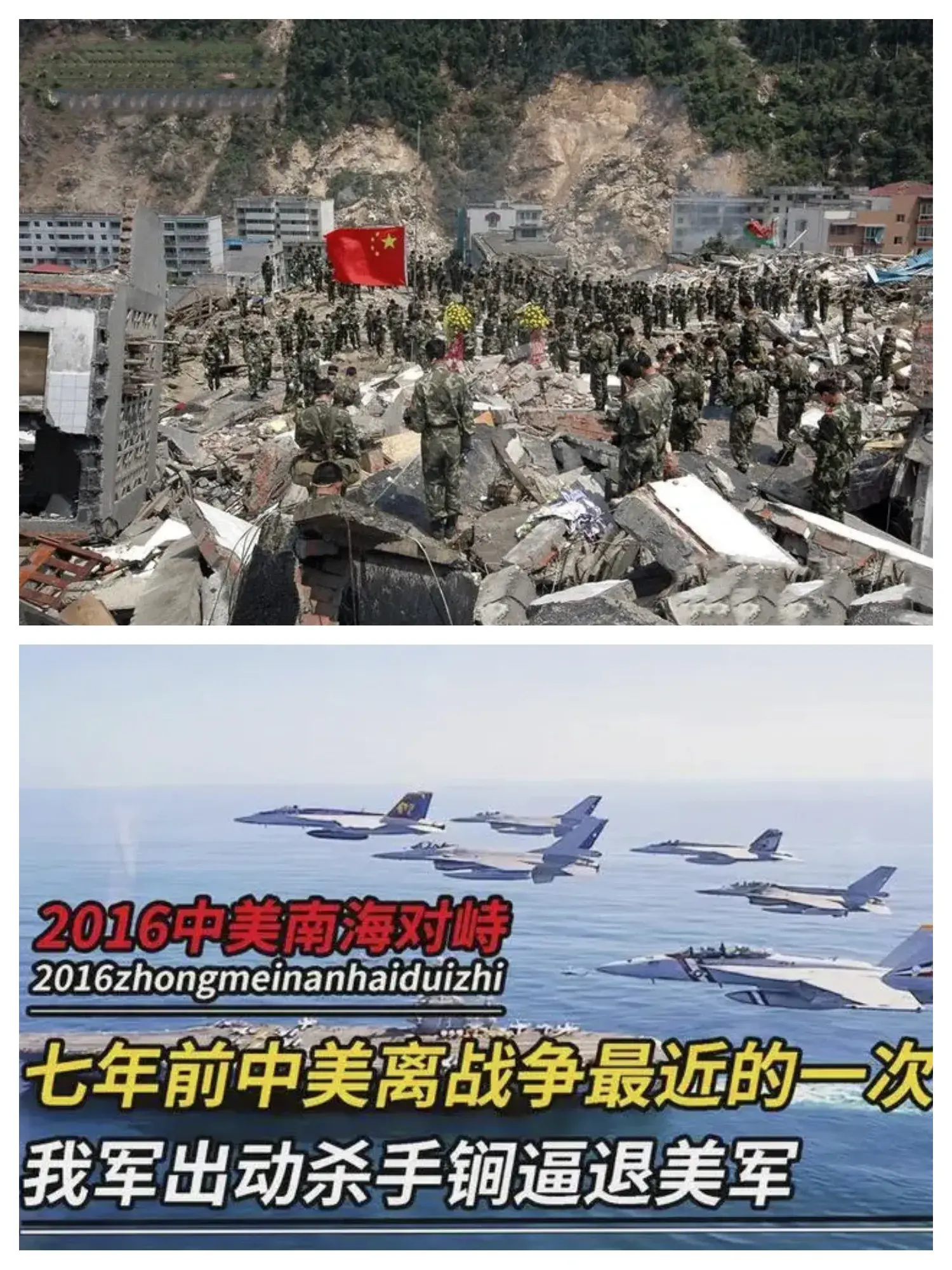 到2008年汶川大地震,15名勇士在五千米惊天一跳,足以证明军民“雨水情”可不只是说说而已。2016年中美南海危机爆发。蓄势待发,公路、铁路上随处可见隆隆驶过的坦克、装甲车。与此同时,我国亿万民众也在为部队加油打气。