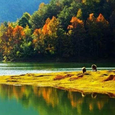 鸟岛、蛇岛、龟岛等诸多岛屿如散落的珍珠一般点缀在万顷碧波之上,形成了独特的红枫湖美景。