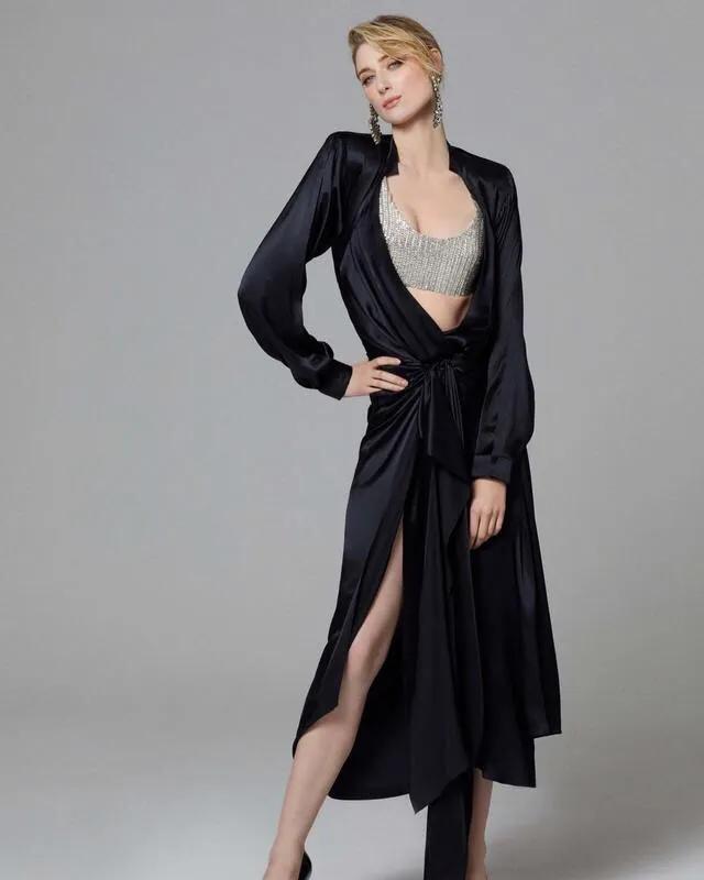 长款丝绸礼服内搭银色短款背心,勾勒出超级完美的身材,纤腰盈盈一握,性感又高级,整个人气场十足,散发着超模气质。
